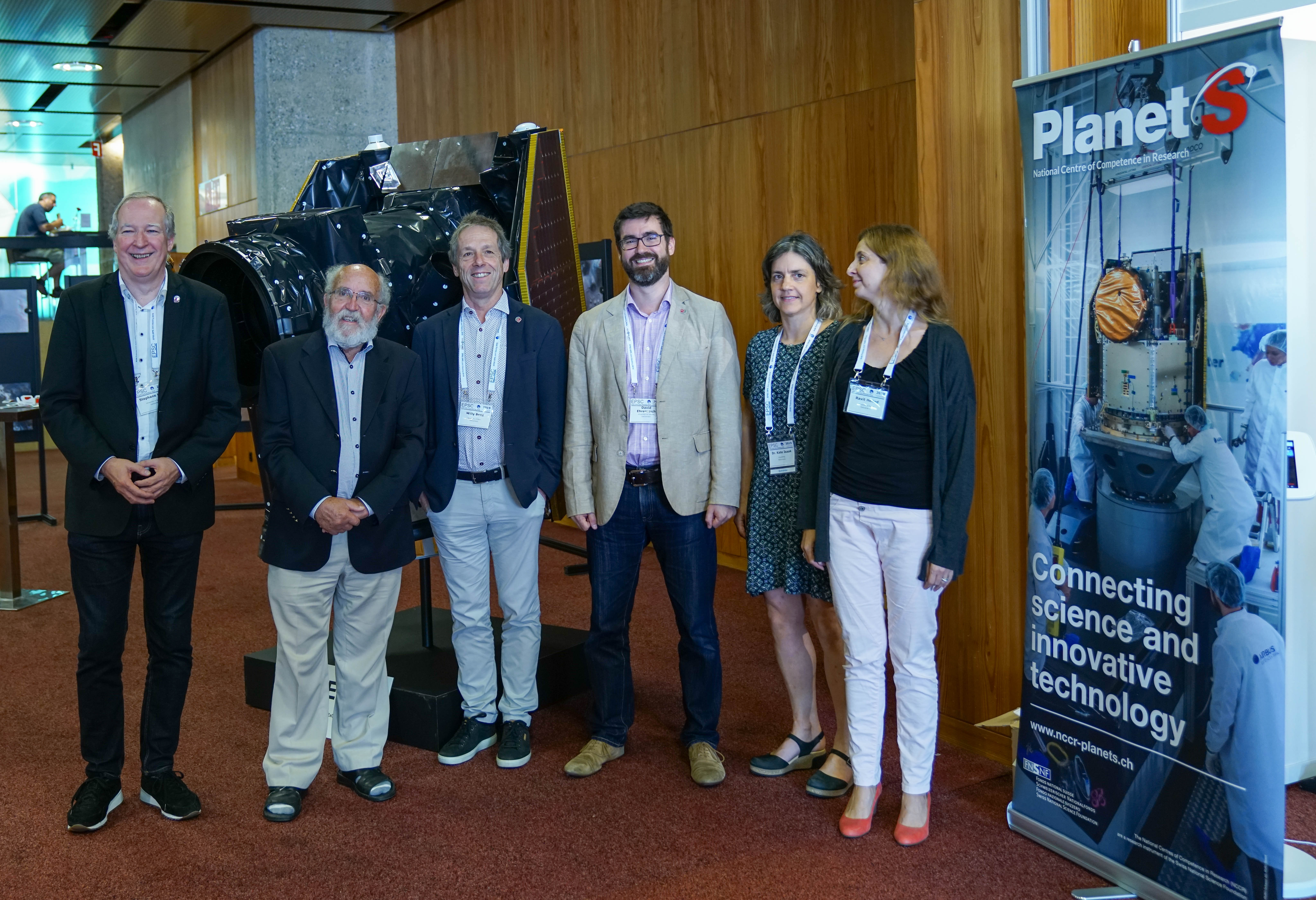 New 1:1 CHEOPS mock-up exposed at the EPSC-DPS 2019, 15 – 20 September 2019, in the hall of the International Conference Centre Geneva (CICG). The event is a joint meeting of the European Planetary Science Congress and the Division for Planetary Sciences of the American Astronomical Society and covers a broad area of science topics related to planetary science and planetary missions. From l. to r.: Stéphane Udry UniGE, director observatory UniGE; Michel Mayor, co-discoverer of 51 Pegas b, emeritus UniGE; Willy Benz, CHEOPS PI, UniBE; David Ehrenreich, CHEOPS mission scientist, UniGE; Kate Isaak, CHEOPS project scientist, ESA; Ravit Hellet, UniZH.