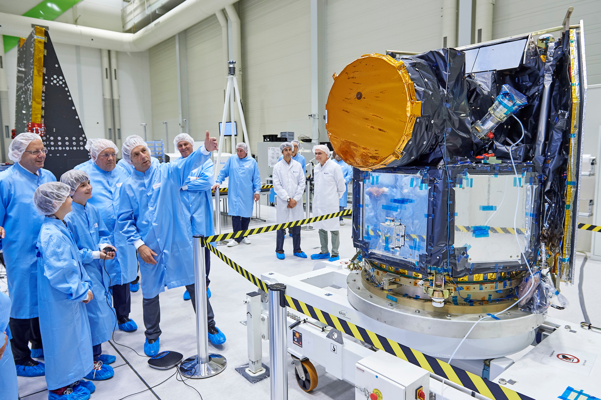 The research satellite CHEOPS was developed jointly by the University of Bern and the European Space Agency ESA. At an event at RUAG in Zurich on 27 August 2018, representatives of the institutions involved in its construction visited the satellite. Among the speakers and guests were Federal Councillor Johann Schneider-Ammann, Jan Wörner, Director General of ESA, and Prof. Willy Benz from the University of Bern, scientific director of the CHEOPS mission.
