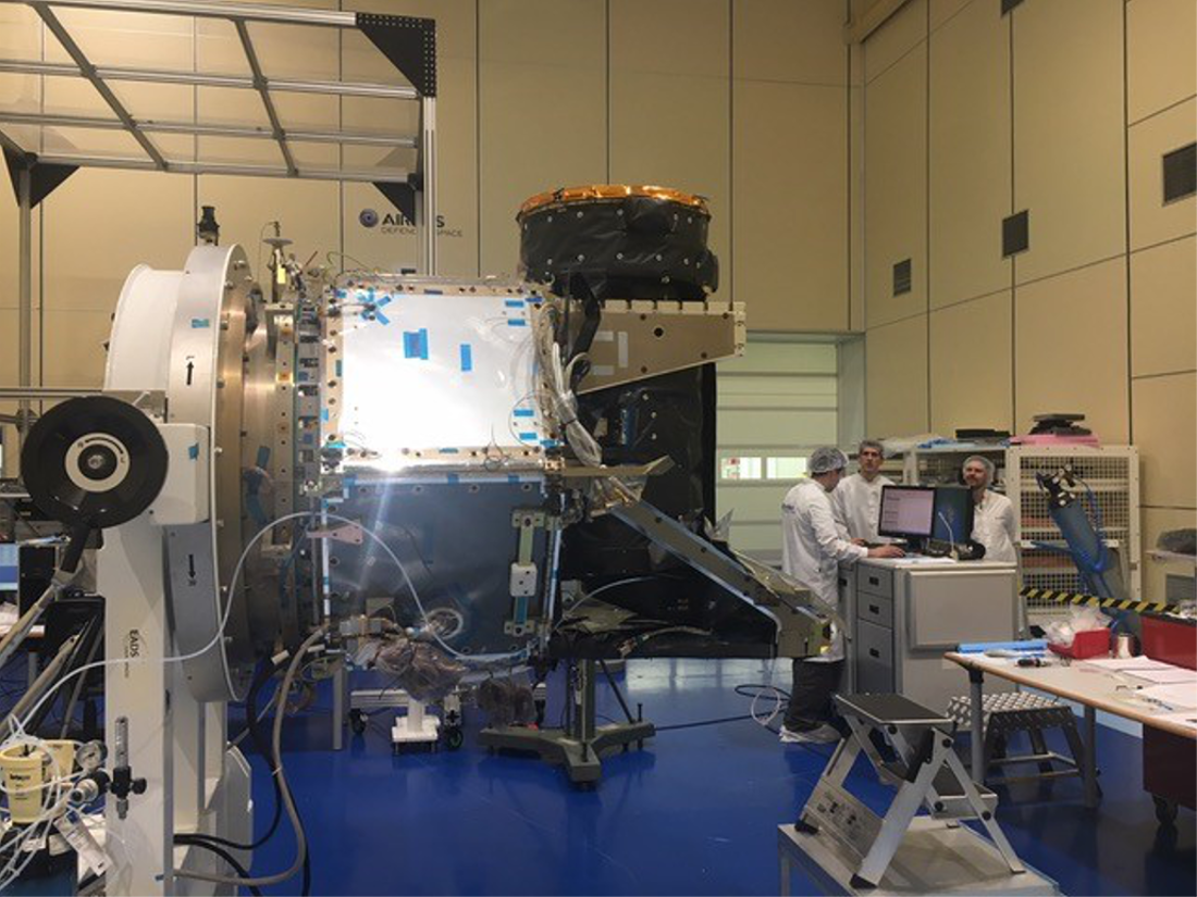 The instrument has been successfully installed onto the satellite platform. In the picture, the satellite is in vertical position for alignment of the instrument: the telescope (bottom part) is being aligned to the baffle (top part with copper colour door). The alignment has been completed within the required accuracy. image courtesy of EADS CASA Espacio, Madrid.